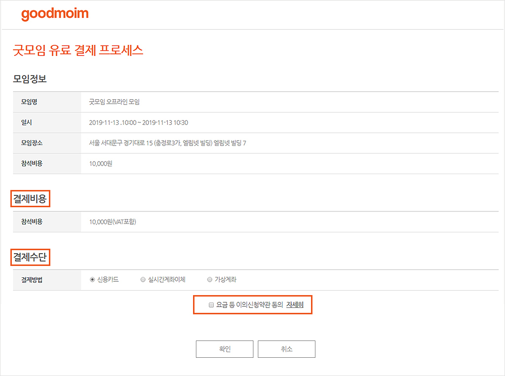 - 모임참가 후 결제 페이지로 이동됩니다. 결제비용, 결제수단 선택, 약관에 동의 후 결제를 진행할 수 있습니다.