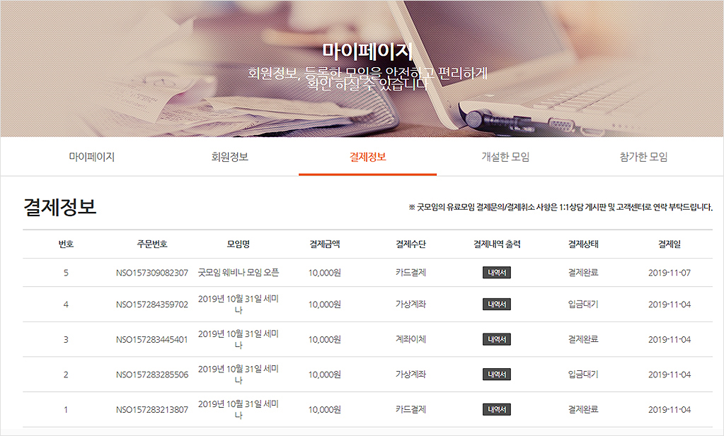 - 로그인 후 마이페이지 > [결제정보]에서 모임 결제금액을 조회할 수 있습니다.